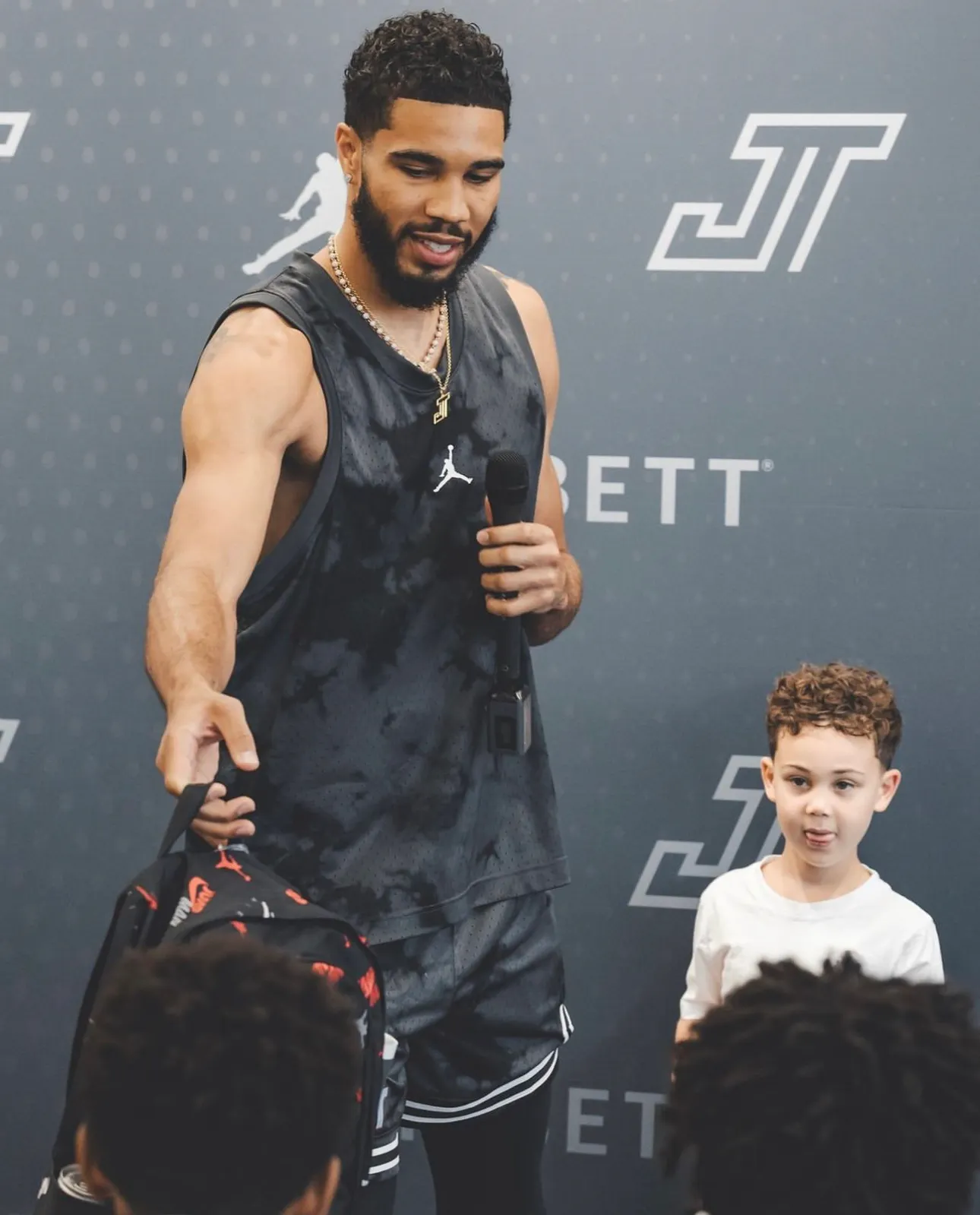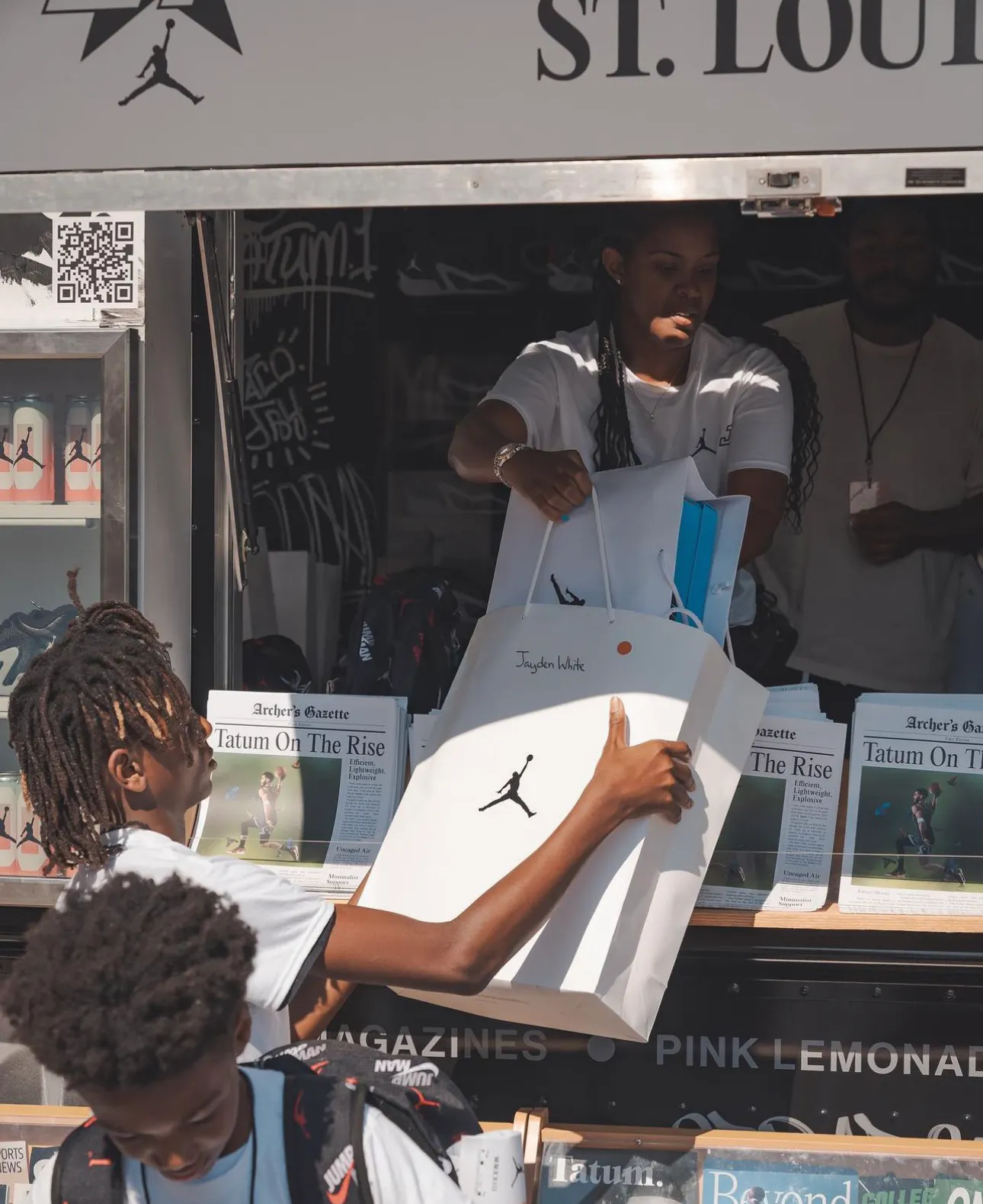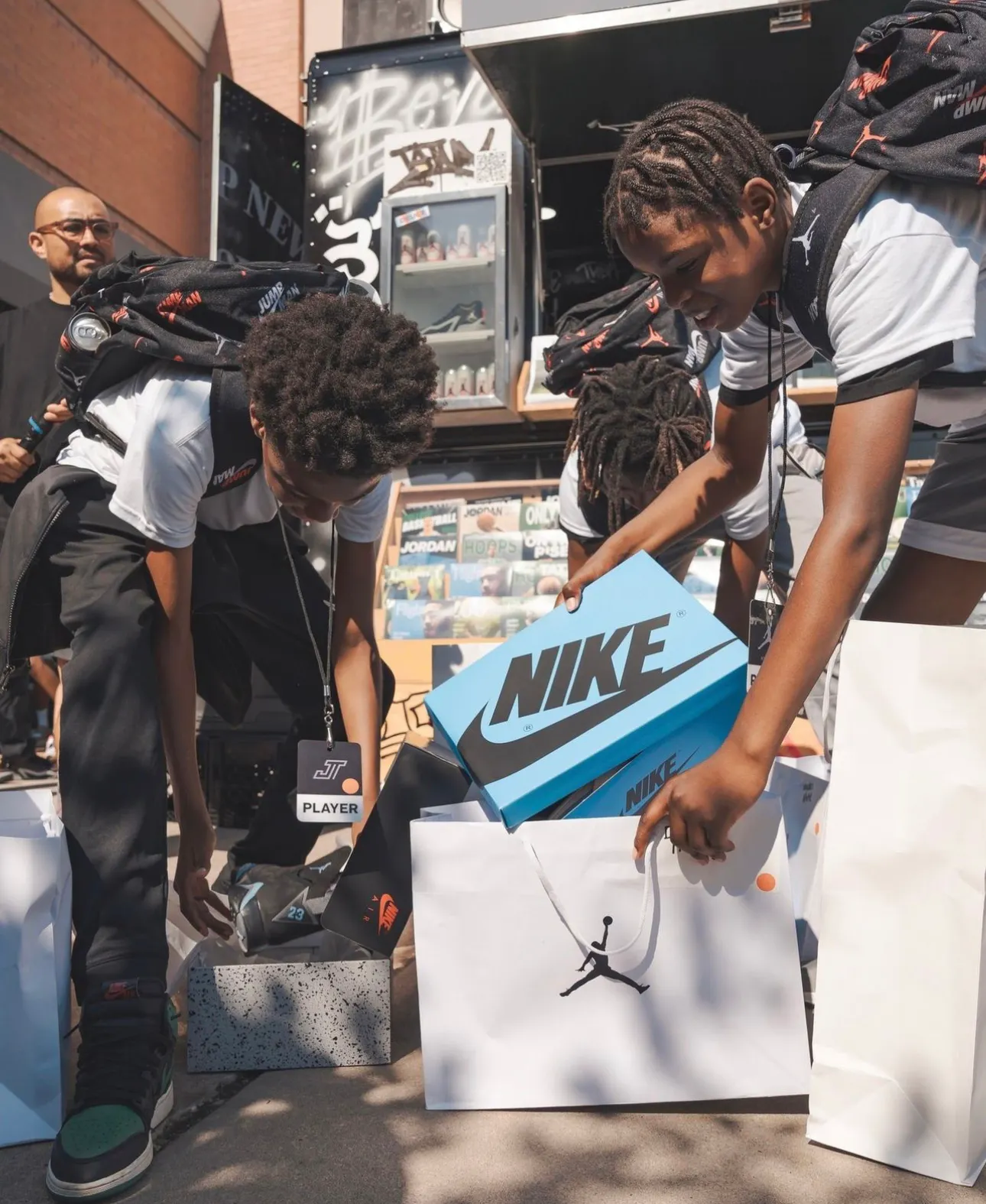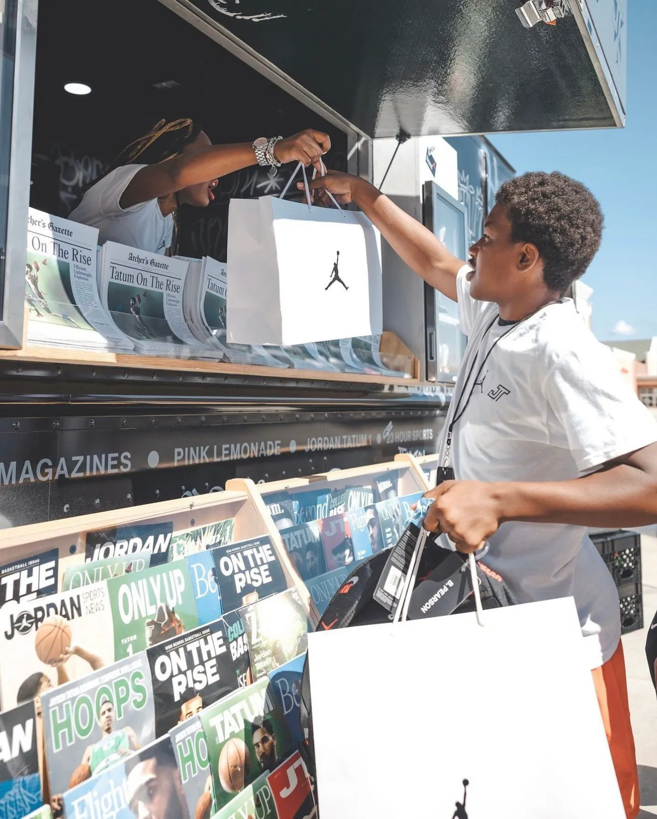 Inside, the kids competed on NBA Jam arcade machines, shot hoops on some branded pop-a-shots, and took photos with their new gear infront of the Tatum step and repeat. Outside, the Tatum bus doled out merch, and engaged the crowd with an NBA 2K setup.